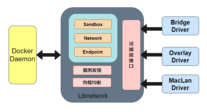 Docker 为实现容器网络,主要采用的架构由三部分组成:CNM、Libnetwork 和驱动。