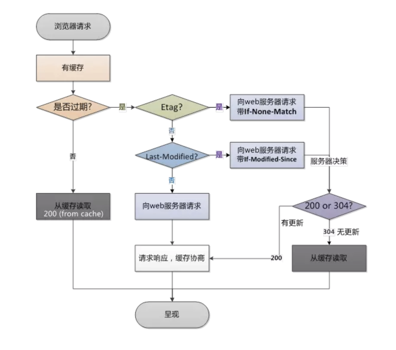 - 服务器比较请求头里的If-modified-since和文件上次修改的时间,如果文件一致就继续使用浏览器的缓存(304),不一致就重新请求服务器并返回last-modified