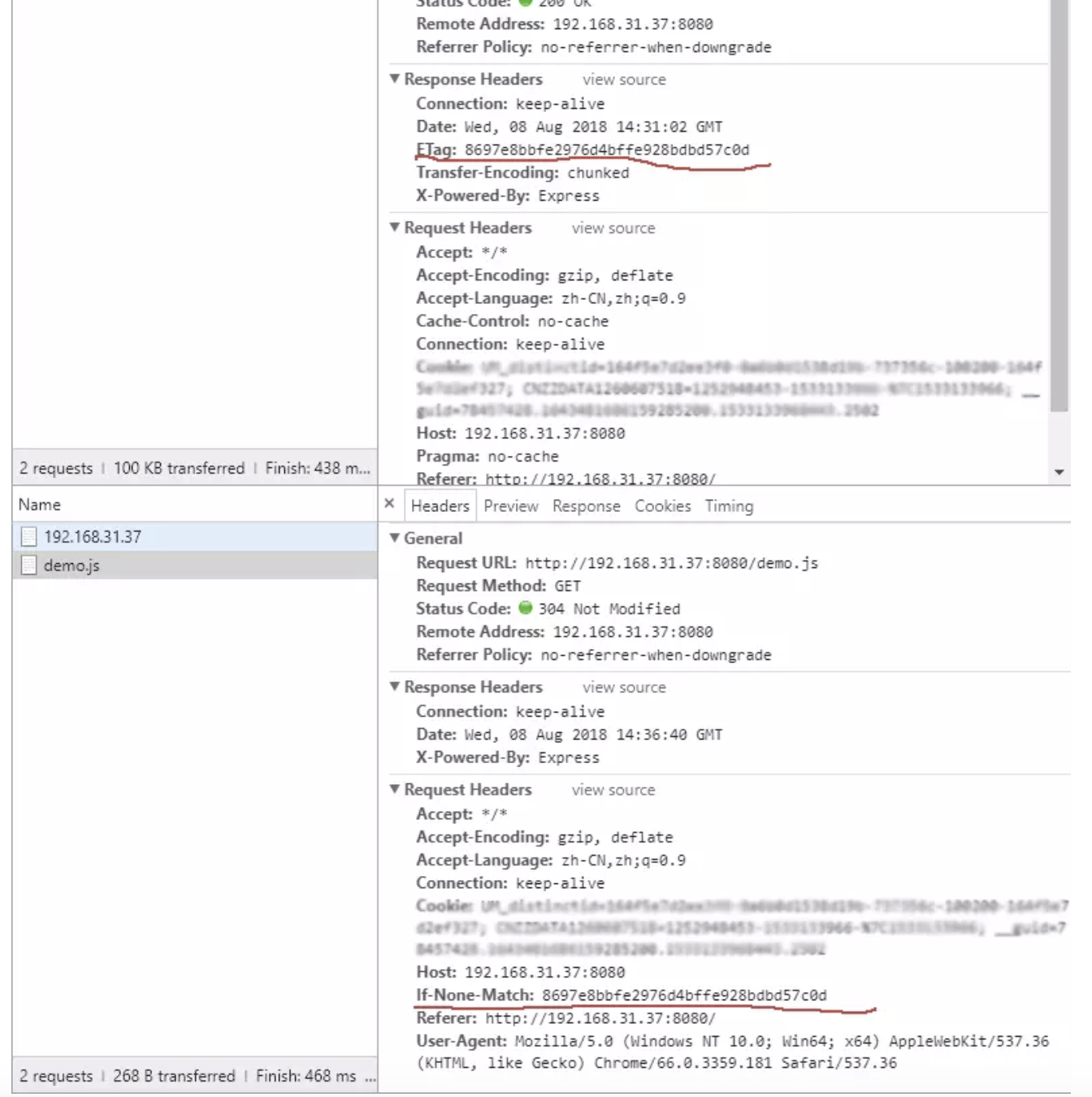 - 当浏览器的缓存文件过期时,浏览器带上If-None-Match(等于上次上次的Etag)再次请求服务器