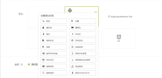 其中,其中部分隐私权限是敏感权限,如电话、位置、相机、麦克风、短信等,需要勾选,并在需要的时候,去申请,平台也提供了相应的接口,