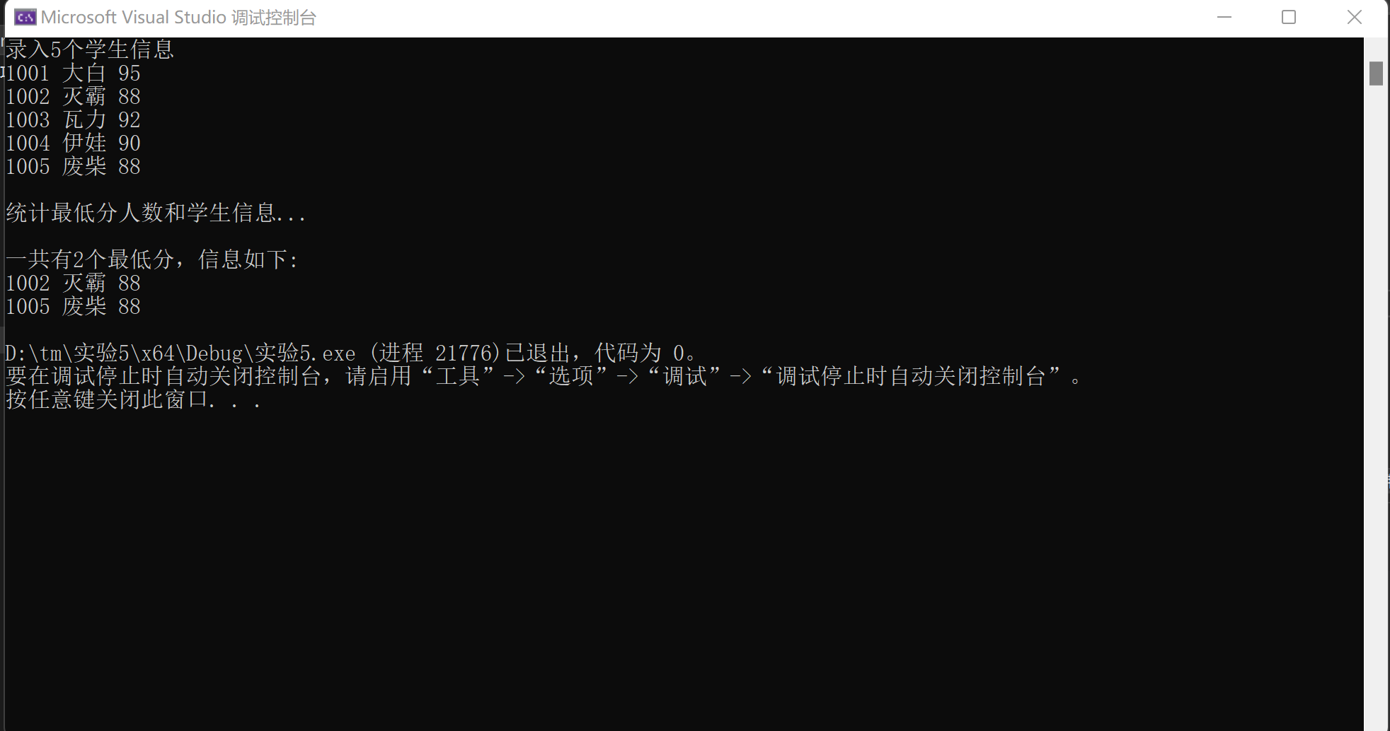 printf("\n一共有%d个最低分,信息如下:\n", count);