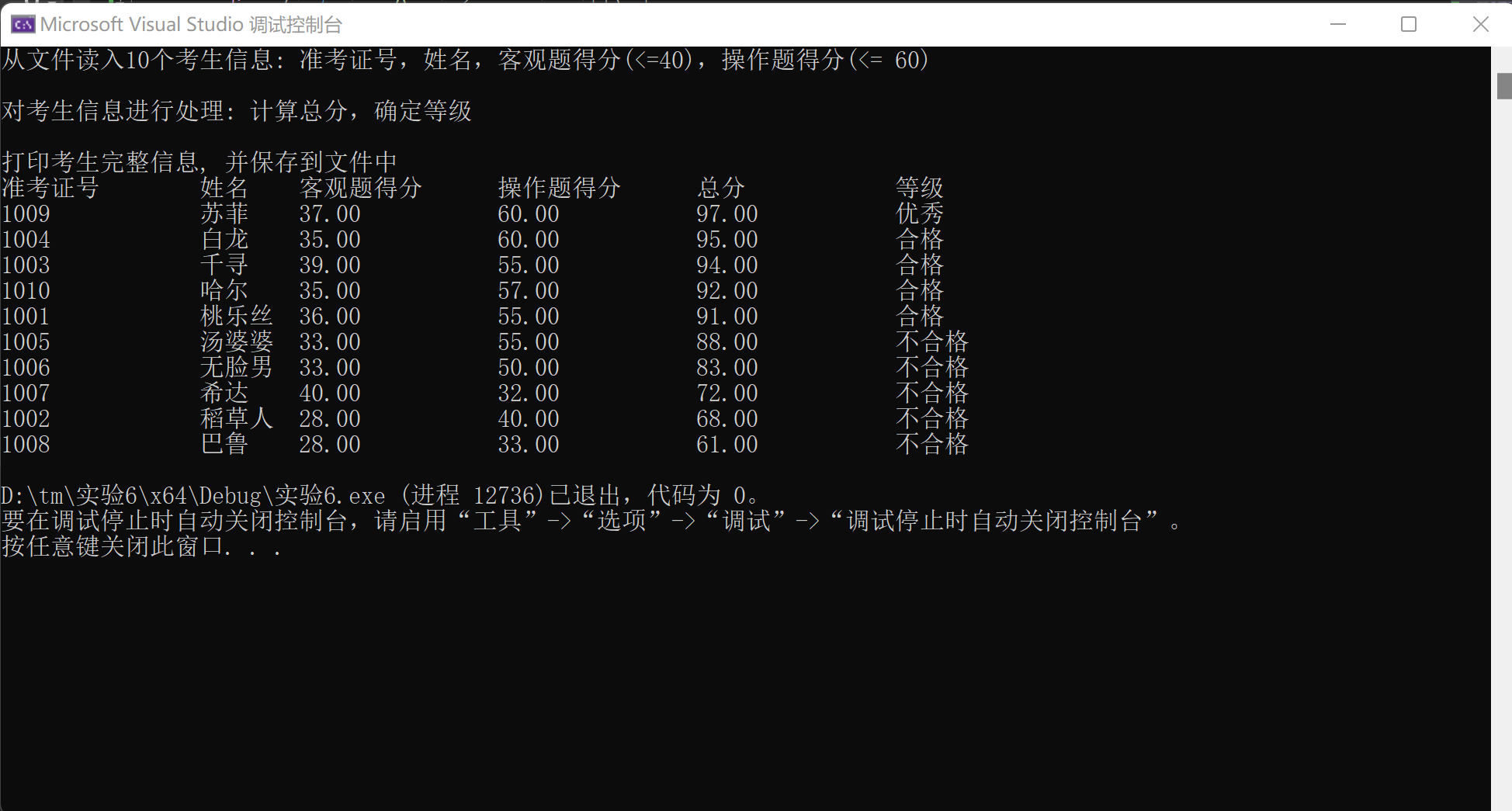 // 输出考生完整信息: 准考证号,姓名,客观题得分,操作题得分,总分,等级
