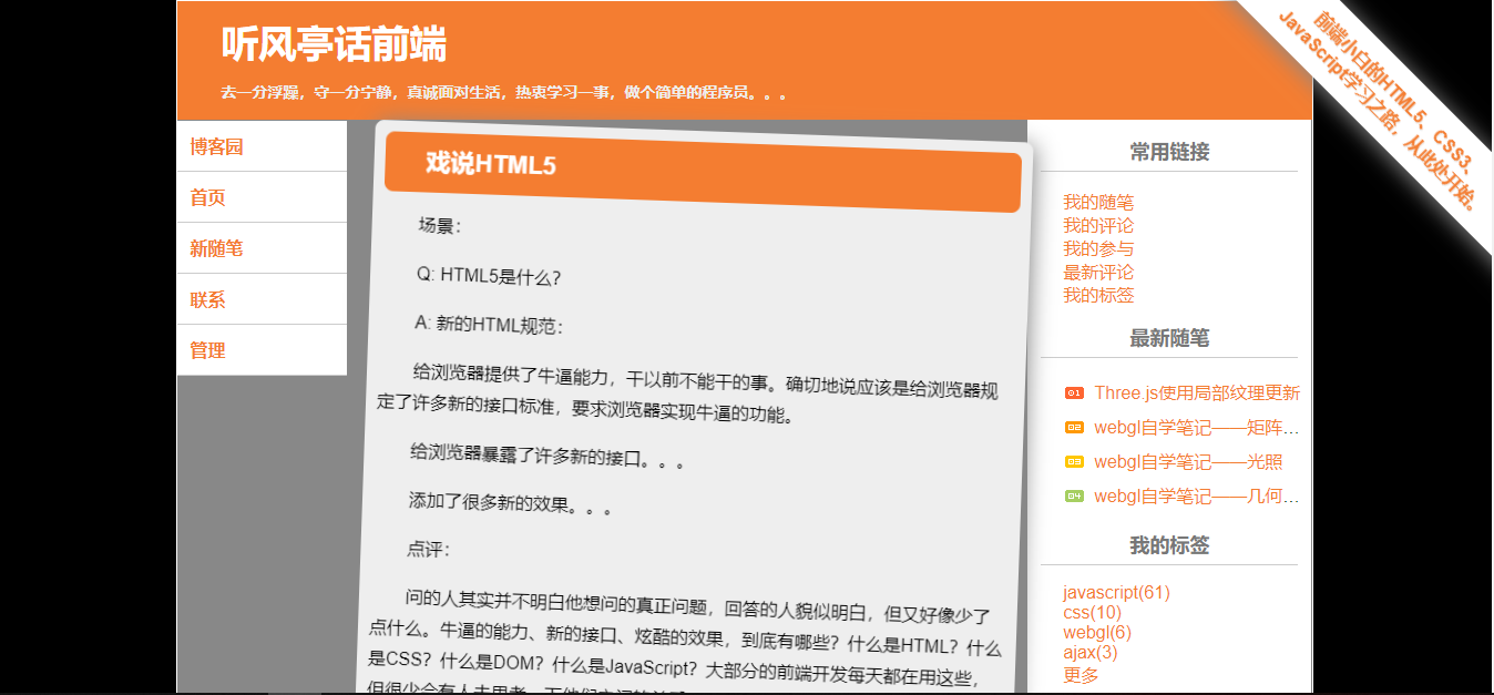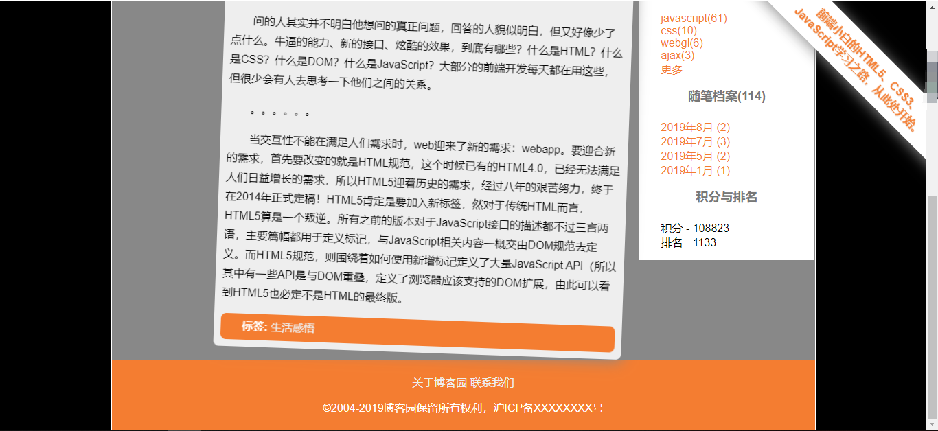 如果觉得上一篇随笔中的项目实战(个人博客首页)的网页缺乏色彩、结构单调的话,可以在<head>头部标签中创建内部样式表,然后添加以下样式设计内容,就可以得到较为美观的静态博客首页了。