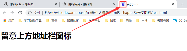 1 <!doctype html> 2 <html> 3 <head> 4 <meta charset="utf-8"> 5 <title>百度一下</title> 6 <link rel="icon" sizes="any" mask href="file:///C:/Users/32282/Pictures/images/icons/baidu_icon.svg"> 7 <link rel="icon" href="file:///C:/Users/32282/Pictures/images/icons/favicon.ico" type="image/x-icon" /> 8 <link rel="shortcut icon" href="file:///C:/Users/32282/Pictures/images/icons/favicon.ico" type="image/x-icon" /> 9 </head> 10 11 <body> 12 <h1>留意上方地址栏图标</h1> 13 <p></p> 14 </body> 15 </html>