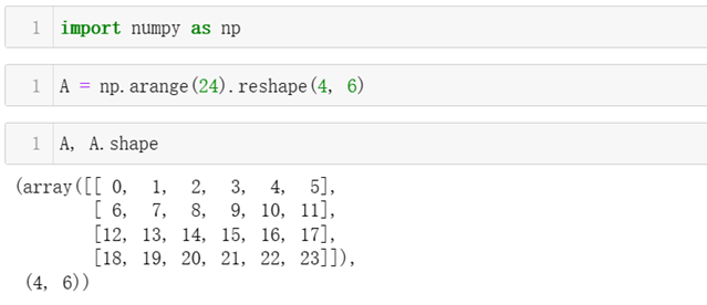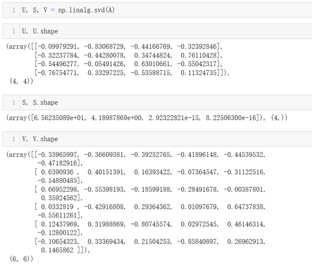 然后调用np.linalg.svd函数对矩阵A进行svd分解,并将分解后的矩阵内容及形状打印出来观察。