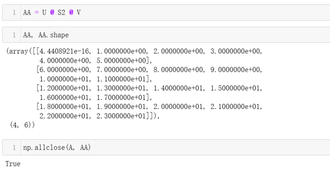 验证U * S2 * V可还原A矩阵,allclose用于验证AA和A是否为相同的矩阵,因为SkLearn里计算的数都为浮点数,很少有2个数绝对相等,即很少有2个相等数,他们的差值为0,在SkLearn里,只要2个数的差值小于1e-6,即认为这2个数相等。