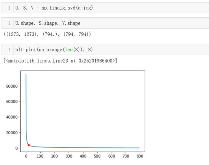 将原图像矩阵进行SVD分解,并将得到的所有奇异值用拆线图绘制出来,拆线图的纵坐标表示奇异值的具体取值,横坐标表示第几个奇异值,因读取的图像大小是1273*794,而奇异值的个数取宽高的最小者,也就是794。从折线图中可看到奇异值的取值快速下降,大约取到第10个奇异值后,剩下的794-10=784个奇异值的大小已经近乎为0了,奇异值的大小代表其所抽取的原矩阵信息量,值越大,所含的信息量越多,从图中可看出,基本前几个奇异值包含了原矩阵绝大部分的信息,剩下的大多数奇异值,基本不包含什么信息。因此,我们可以只取前面几个奇异值,并相应裁减左奇异矩阵U和右奇异矩阵V,然后将裁减后的矩阵相乘,就可得到压缩后的新矩阵。