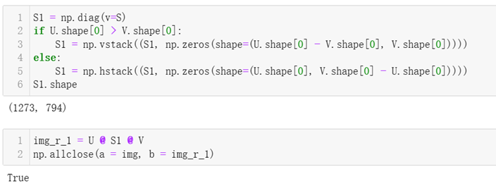 先将奇异值S向量扩充为形状为1273*794的S1矩阵,然后将U * S1 *V还原图像,得到矩阵img_r_1,先调用np.allclose从数值角度检验原图像和还原后的图像是否一样。输出True表示还原后的图像和原图是一样的。