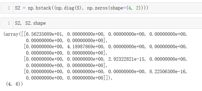 因为S的形状是4 * 1的,即4个奇异值,为实现其与左奇异矩阵U和右奇异矩阵V的连乘,需将S的形状补全为4*6的。先将S变换为4*4的对角阵,对角线的4个元素为对应的4个奇异值,然后将对角阵的列补全为4*6的矩阵S2,即新增2列,列的内容全为0。