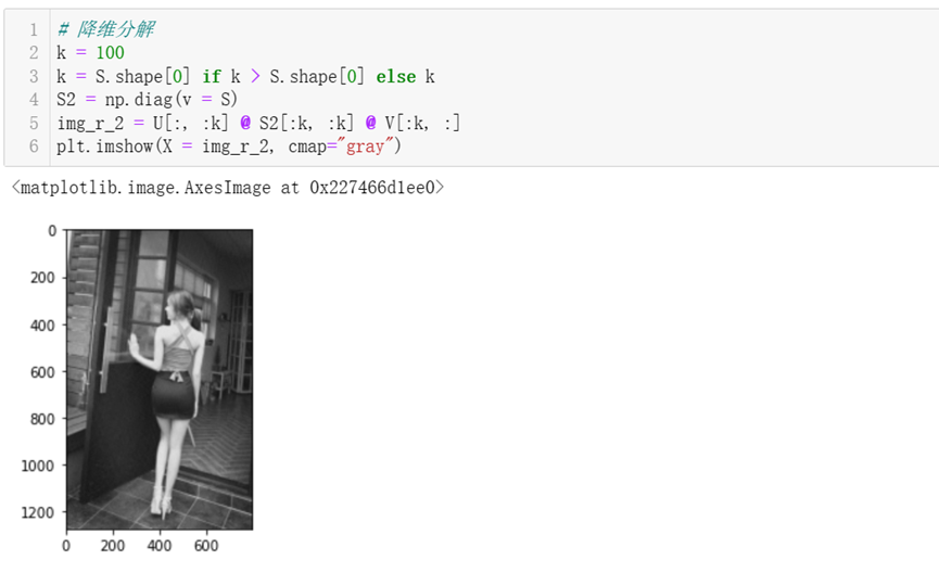 下面取前k=100个奇异值,将求出对应的压缩图像并显示,可看出前20个奇异值包含的信息,基本和原图差不多了。