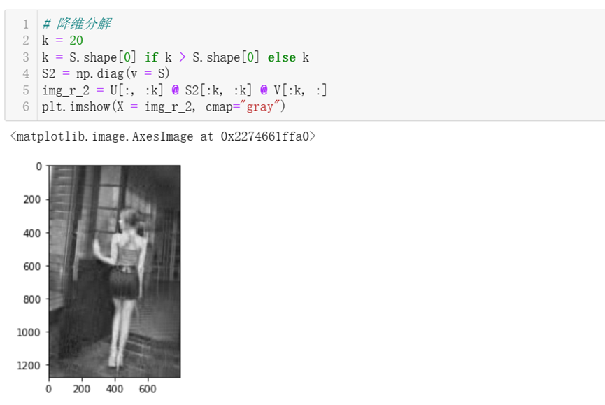 下面取前k=20个奇异值,将求出对应的压缩图像并显示,可看出前20个奇异值包含的信息,比k=10又清晰了一些。
