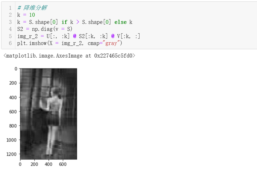 取前k=10个奇异值,将求出对应的压缩图像并显示,可看出前10个奇异值包含的信息,把原图的信息基本都展示出来了。