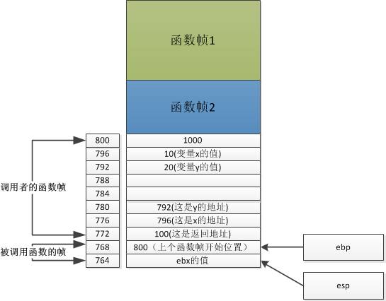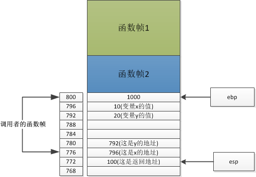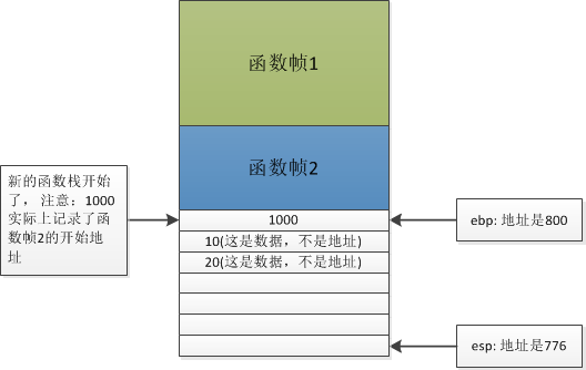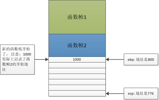 “把esp的值赋给ebp”你看看,是不是新的函数帧生成了?只不过现在只有一行数据。ebp和esp指向同一地址。函数帧的第一行的地址是800,里边的内容是1000,也就是上个函数帧的地址。