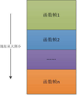 多个函数帧在内存里排起来, 就像一个先进后出的栈一样,不过,这个栈不像我们常见的栈,栈底在下面。相反,这个栈的栈底在上面,是从上往下生长的 (或者说是从高地址向低地址生长的)。