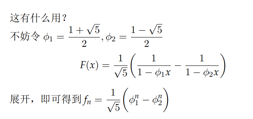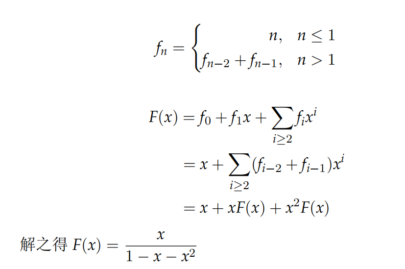 实际上普通型生成函数中的xi不一定表示大小为i的组合对象,i也可代表序号,如斐波那契数列的生成函数:
