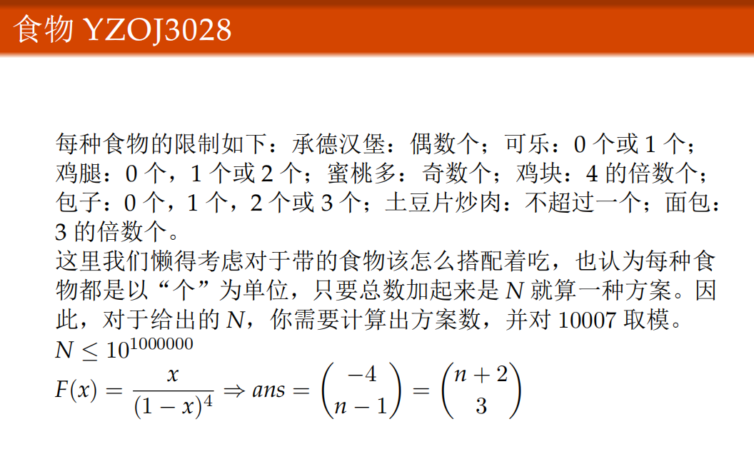 枚举所用的骨牌数量k,把Ak(x)在xn的系数累加起来,发现答案为1/(1-A(x))在xn的系数