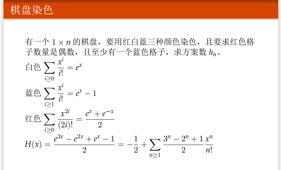 其中xn/n!代表 n个格子的组合对象,系数代表n个格子的方案数。一开始只有一种方案,就是n个格子全填白/蓝/红(0个格子蓝色/奇数格子红色 的方案数设为0)。