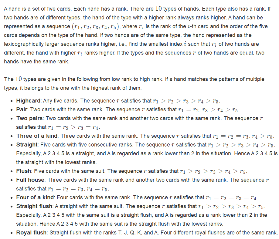 主要还是得理清出题人的意图,想清楚是否每种手牌都会有排名,如果某种手牌没有排名或排名很怪,那可能是题意理解有误。