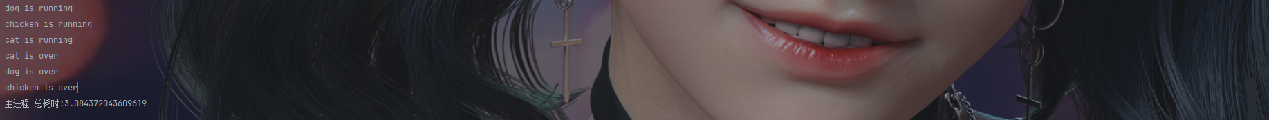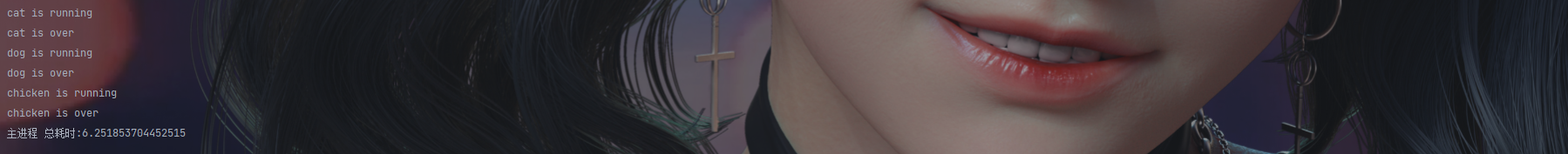 from multiprocessing import Process import time def task(name, n): print(f'{name} is running') time.sleep(n) print(f'{name} is over') if __name__ == '__main__': p1 = Process(target=task, args=('cat', 1)) p2 = Process(target=task, args=('dog', 2)) p3 = Process(target=task, args=('chicken', 3)) start_time = time.time() p1.start() p1.join() p2.start() p2.join() p3.start() p3.join() end_time = time.time() - start_time print('主进程', f'总耗时:{end_time}')