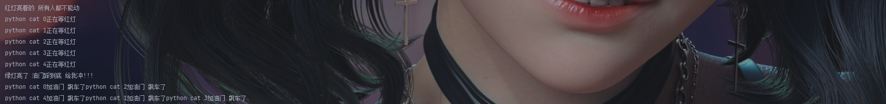 from threading import Thread, Event import time event = Event() # 类似于造了一个红绿灯 def light(): print('红灯亮着的 所有人都不能动') time.sleep(3) print('绿灯亮了 油门踩到底 给我冲!!!') event.set() def car(name): print('%s正在等红灯' % name) event.wait() print('%s加油门 飙车了' % name) t = Thread(target=light) t.start() for i in range(5): t = Thread(target=car, args=('python cat %s' % i,)) t.start()