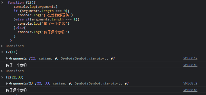 """ 函数定义: function 函数名(参数1,参数2){ 函数体代码 return 返回值 } 1.function 定义函数的关键字 相当于python中的def 2.函数名的命名参考变量名 并且js推荐使用驼峰体(Myfunc\MyFunc) 3.参数可写可不写 4.return返回值 函数调用: 函数名加括号 有参则传参即可!!! """ # 1.无参函数 function f1(){console.log(111)} f1() # 2.有参函数 function f2(a, b){console.log(a,b)} f2() # 可以调用 相当于传了两个undefined f2(1) # 可以调用 f2(1,2) # 可以调用 f2(1,2,3,4,5) # 可以调用 '''js中的函数提供了有个内置关键字arguments:接收所有参数''' function f2(){ console.log(arguments) if (arguments.length === 0){ console.log('什么参数都没传') }else if(arguments.length === 1){ console.log('传了一个参数') }else{ console.log('传了多个参数') } } # 3.返回值参数 return不支持返回多个数据 # 4.匿名函数 var ff = function (){ console.log(123) } # 5.箭头函数(drf中vue框架会再次接触) var f = v => v; // 等同于(箭头左边是形参右边是返回值) var f = function(v){ return v; } var f = () => 5; // 等同于 var f = function(){return 5}; var sum = (num1, num2) => num1 + num2; // 等同于 var sum = function(num1, num2){ return num1 + num2; //这里的return只能返回一个值,如果想返回多个值需要自己手动给他们包一个数组或对象中 } """针对js的函数学习到这里就足够了"""