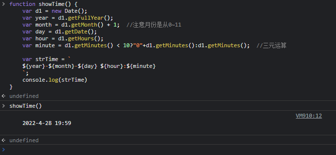 # 内置对象可以看成是python中的内置方法 内置模块等提前写好直接调用 # 1.Date对象 var d1 = new Date() d1.toLocaleString() '2022/4/28 10:47:01' d1.toLocaleDateString() '2022/4/28' d1.toLocaleTimeString() '10:47:01' //getDate() 获取日 //getDay () 获取星期 //getMonth () 获取月(0-11) //getFullYear () 获取完整年份 //getYear () 获取年 //getHours () 获取小时 //getMinutes () 获取分钟 //getSeconds () 获取秒 //getMilliseconds () 获取毫秒 //getTime () 返回累计毫秒数(从1970/1/1午夜) function showTime() { var d1 = new Date(); var year = d1.getFullYear(); var month = d1.getMonth() + 1; //注意月份是从0~11 var day = d1.getDate(); var hour = d1.getHours(); var minute = d1.getMinutes() < 10?"0"+d1.getMinutes():d1.getMinutes(); //三元运算 var strTime = ` ${year}-${month}-${day} ${hour}:${minute} `; console.log(strTime) }; showTime();