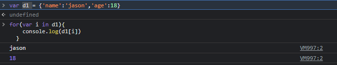 # 自定义对象(相当于python里面的字典) var d1 = {'name':'jason','age':18} python字典取值操作js中的自定义对象都有 并且自定义对象还可以直接通过句点符取值 更像一个对象 取值操作 d1.name # jason 循环取值 for(var i in d1){ console.log(d1[i]) } 定义自定义对象还有一种标准格式(自定义对象 内置对象 第三方对象) var d2 = new Object() # 相当于生成了空字典 """自行查阅往期笔记 实现字典句点符取值"""