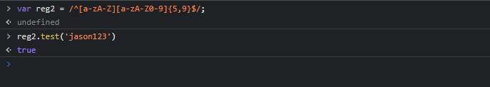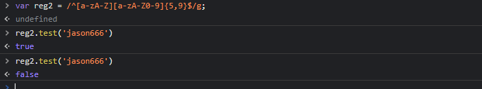 # 创建正则表达式的两种方式 var reg1 = new RegExp("^[a-zA-Z][a-zA-Z0-9]{5,11}"); var reg2 = /^[a-zA-Z][a-zA-Z0-9]{5,9}$/; # 推荐使用(简化) # 使用正则 reg2.test('jason123') true '''括号内什么都不写 就相当于写了undefined''' reg2.test() true """ 验证 var reg3 = /undefined/ reg3.test('jason666') false reg3.test('undefined') true reg3.test() true """ # 全局匹配 在正则表达式的最后添加一个字母g var reg2 = /^[a-zA-Z][a-zA-Z0-9]{5,9}$/g; reg3.lastIndex 0 reg3.test('jason666') true reg3.lastIndex 8 reg3.test('jason666') false