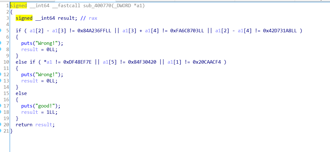 连续输六个内容。。其实都要正确吧。输入保存在v6中,下面的for循环对v6做了一些操作,先看最后应达成的条件,应该是要让sub_400770这个函数返回非零值,跟进查看