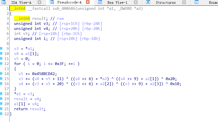 这里做了很多的异或操作,其实看起来和tea加密差不多。。但是不太一样,可以参照一下tea的加密原理