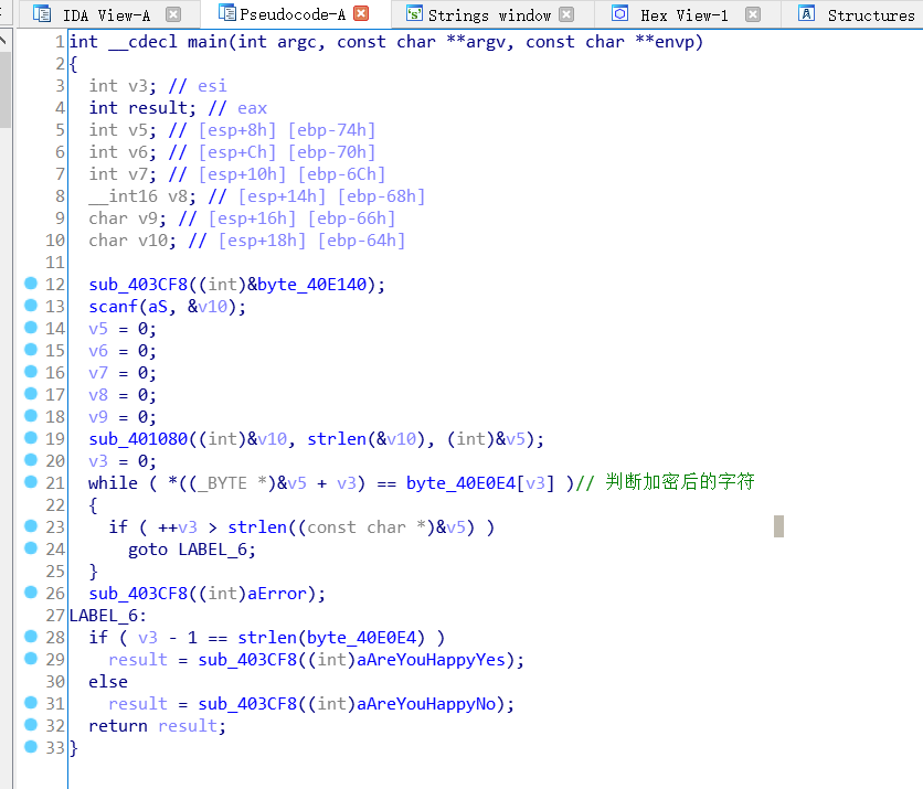 程序很清晰,输入存储到v10,然后用sub_401080函数加密,while循环判断加密后的密文是否正确,byte_40E0E4数组可以直接看到,也就是密文