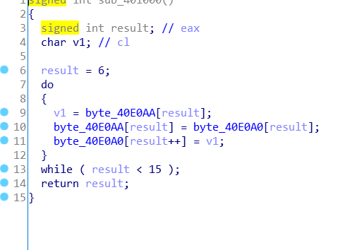 最开始执行了sub_401000函数,对byte_40E0AA和byte_40E0A0数组做了改变,其实两个数组也是一起用的