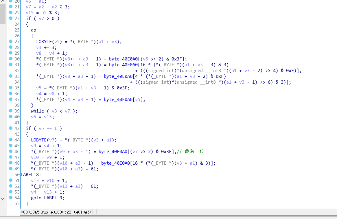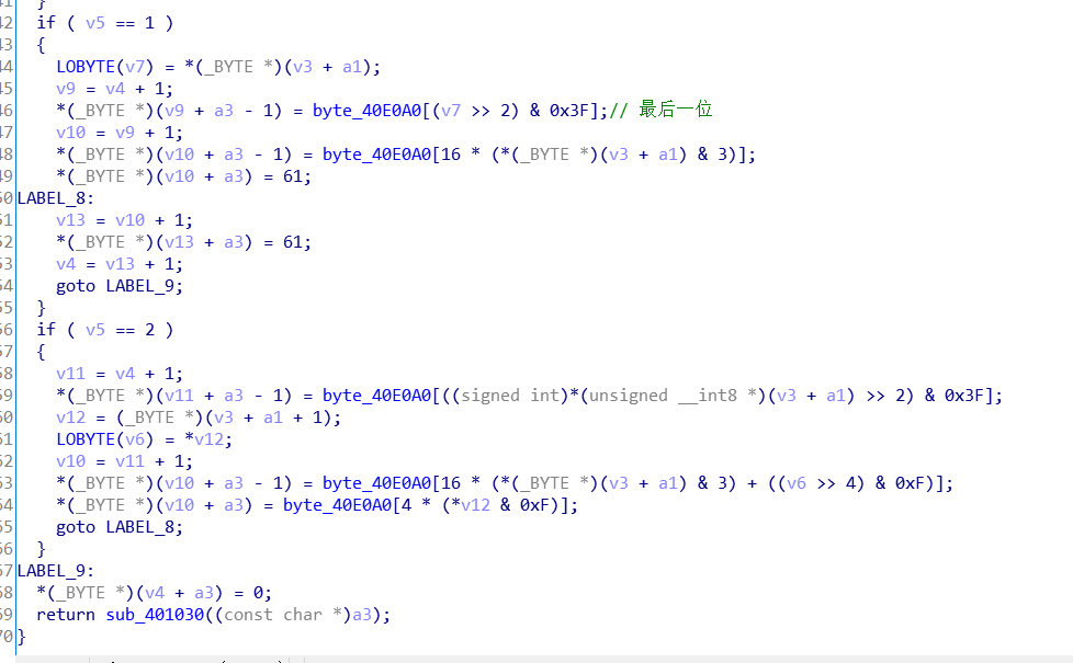 而v5是和flag的长度有关的,分析两个if语句的赋值可以知道都是赋值了四个字符,而我们得到的密文长度是36,那么上面while循环里赋值了32个字符,32%3=2,所以进的应该是第二个if循环,所有的字符都是base64方式的加密,但是编码表有改变,前面sub_401000函数改变了编码表数组