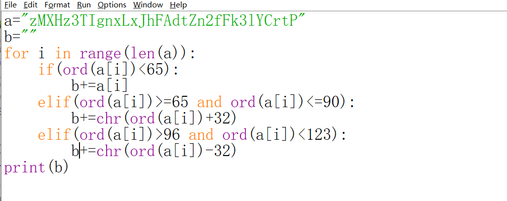 然后的sub_401030函数把得到的字符串大小写互换,得到最终的密文,知道流程后就可以写脚本了,这里我没有写完整的脚本,而是一步一步解决问题的