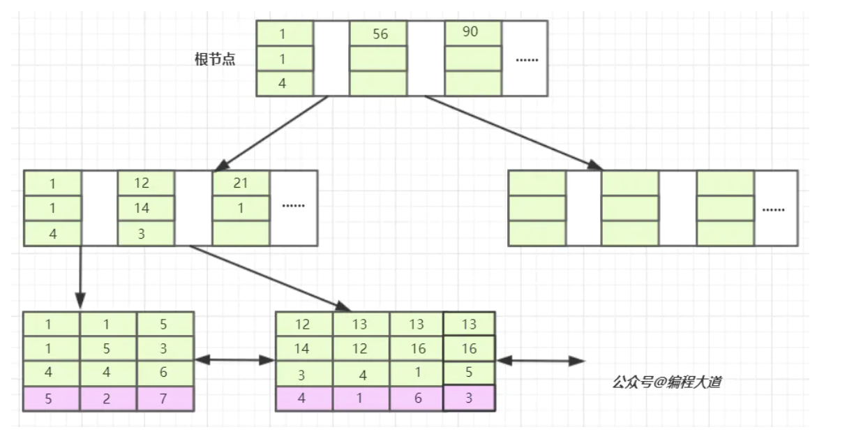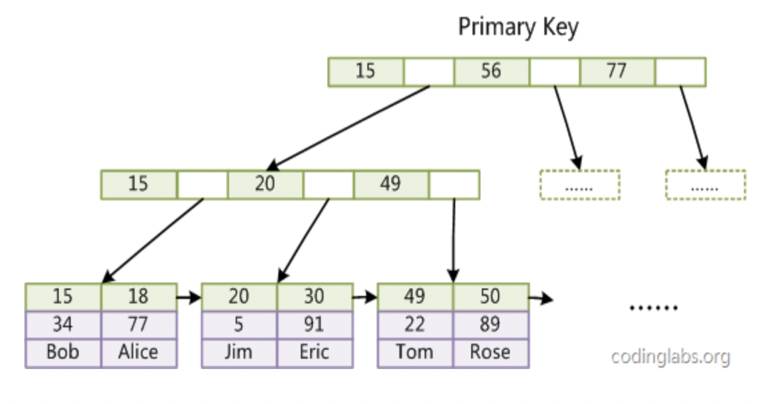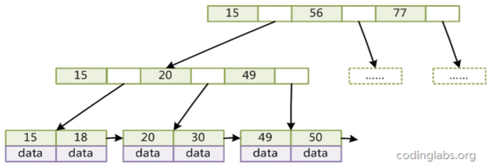 - 每个叶子节点增加一个指向相邻叶子节点的指针,提高了区域访问的性能。例如:查询key为从18到49的所有数据记录,当找到18后,只需顺着节点和指针顺序遍历就可以一次性访问到所有数据节点,极大提到了区间查询效率。