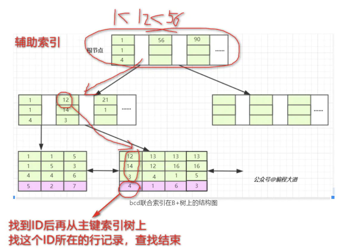 联合索引(b,c,d)也会生成一个索引树,同样是B+树的结构,只不过它的data部分存储的是联合索引所在行的主键值(上图叶子节点紫色背景部分)。