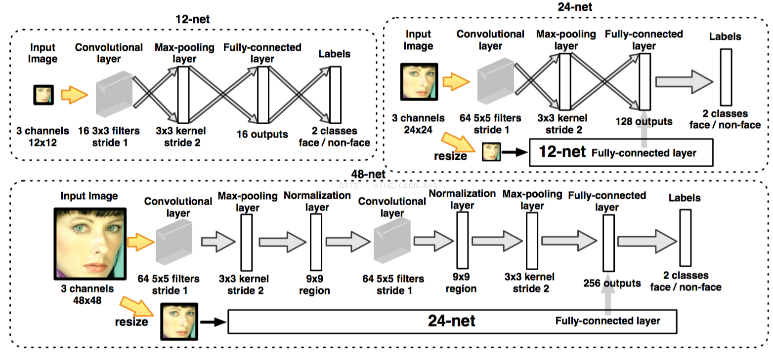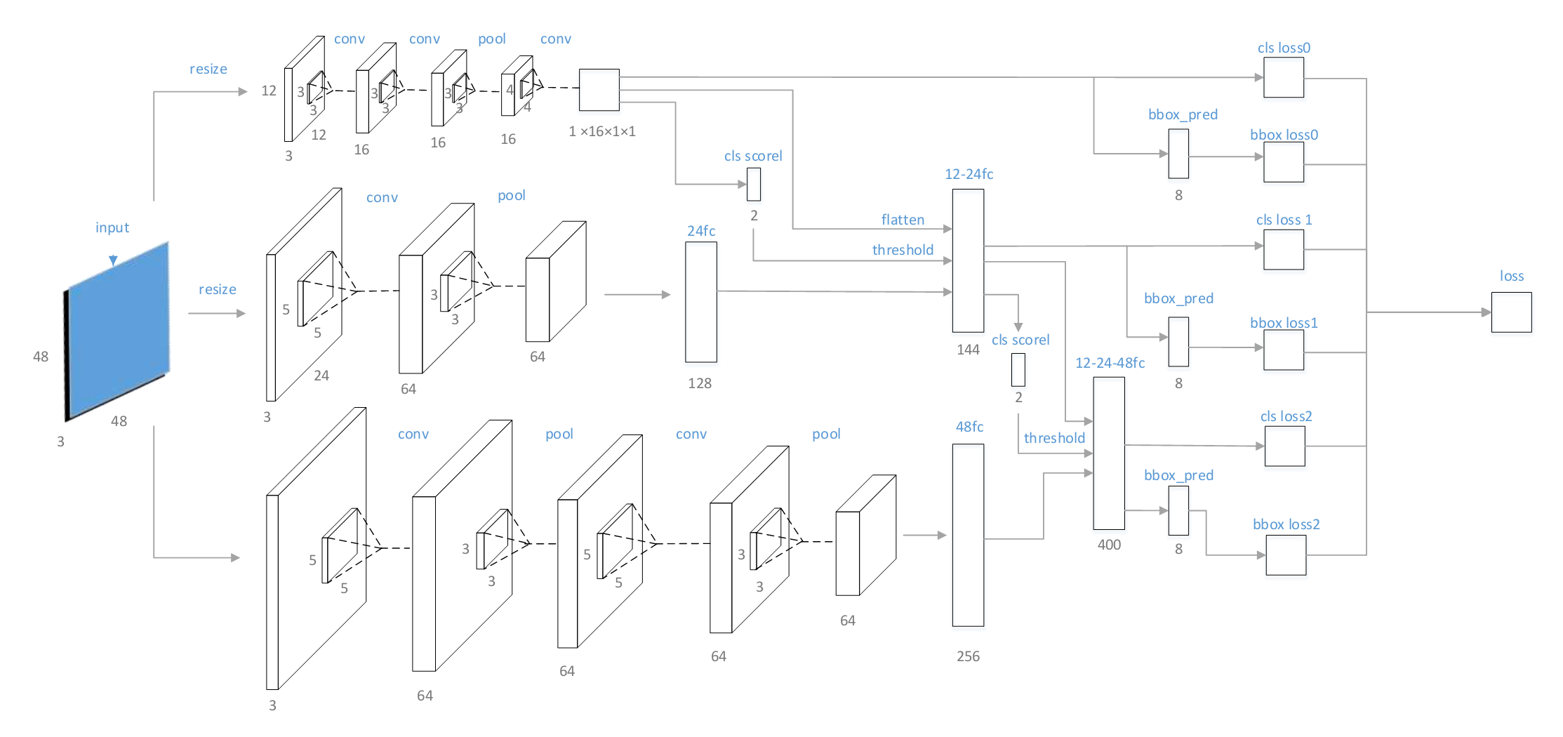 先是3个特征提取网络,12net,24net和48net,代表属于输入的图片格式大小。即使用12*12的滑动窗口进行滑动,提取图片输入网络中。12net的作用是先大量粗晒不符合的图片,为下一步准备分类减少负担。注意24net和48net都有一个分支,这个分支也会提取特征,然后与24net或48net的全连接层组合,一起判断是否属于人脸。