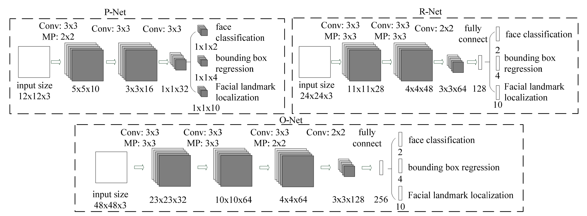 精细的网络结构如下图。可以看到和Cascade还是很像的,都是级联网络,加入了关键点检测,同时第一层12*12网络也去掉了全连接层: