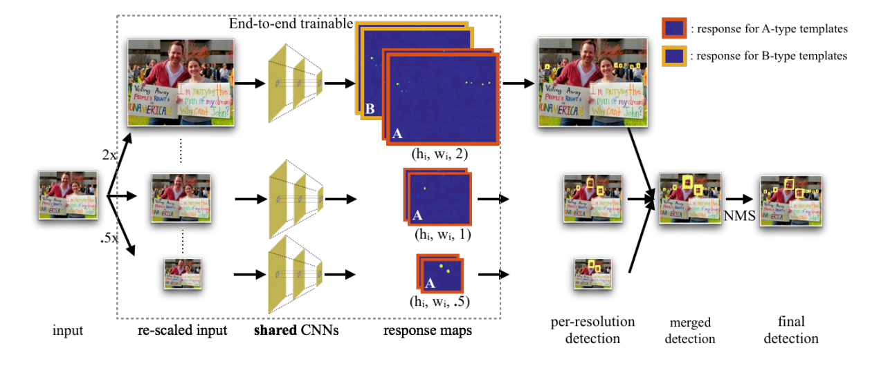 1. 模板固定,即人脸大小固定,输入不同resize后的图像。