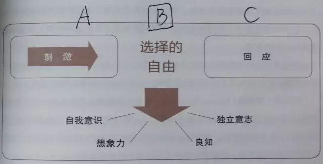 我们都生活在“刺激-->反应”模式中,面对一个刺激,积极主动的人会自己选择如何反应。心理学中有一个ABC理论,说的也是这个模式。A代表事件,B表示个人对事件的解释,C代表个人承受的情绪或压力。已经发生的事实最大,不可能改变,但我们可以通过改变B,即我们对事件的解释来改变我们的反应(情绪或压力)。也就是说,我们拥有选择的自由,按照上图,如果一个人拥有自我意识、想象力、良知和独立意志,就可以按照自己内心的原则来选择如何反应。