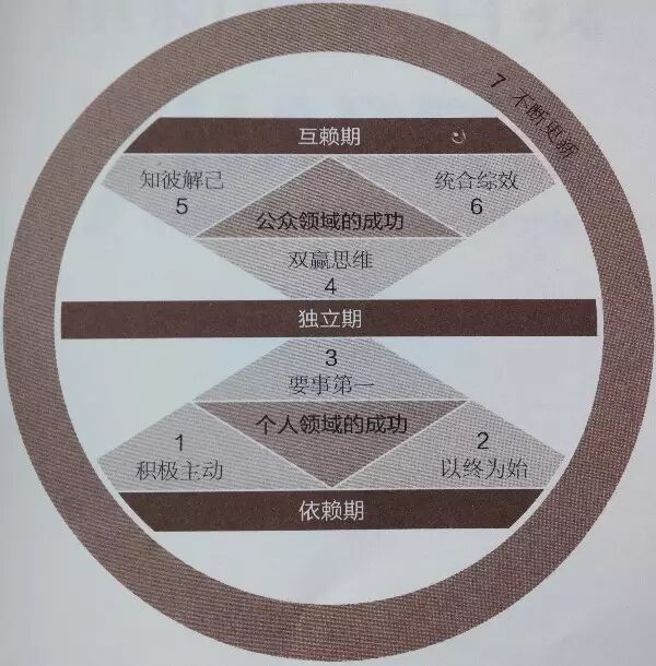 史蒂芬·柯维把个人发展的三个时期和高效能人士的7个习惯统合起来,绘制了一张模型图,形象了表达了7个习惯的顺次关系以及它们和三个时期的关系:
