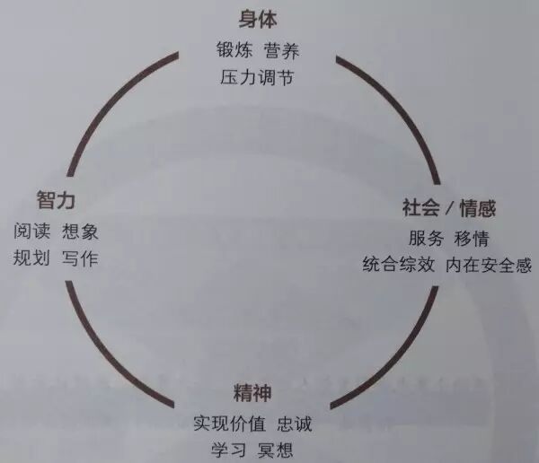 自我提升和完善可以从四个层面来做:身体、精神、智力、社会/情感。参考下图: