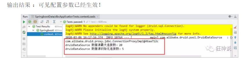 @SpringBootTest class SpringbootDataJdbcApplicationTests { //DI注入数据源 @Autowired DataSource dataSource; @Test public void contextLoads() throws SQLException { //看一下默认数据源 System.out.println(dataSource.getClass()); //获得连接 Connection connection = dataSource.getConnection(); System.out.println(connection); DruidDataSource druidDataSource = (DruidDataSource) dataSource; System.out.println("druidDataSource 数据源最大连接数:" + druidDataSource.getMaxActive()); System.out.println("druidDataSource 数据源初始化连接数:" + druidDataSource.getInitialSize()); //关闭连接 connection.close(); } }