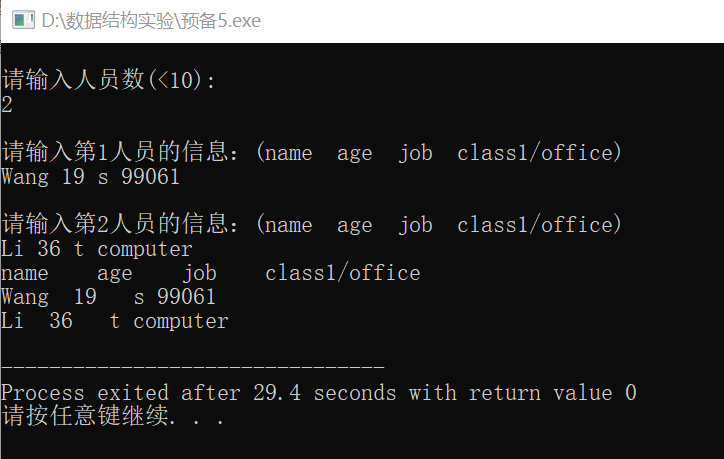 5、 调试程序:设有一个教师与学生通用的表格,教师的数据有姓名、年龄、职业、教研室四项,学生有姓名、年龄、专业、班级四项,编程输入人员的数据,再以表格输出。