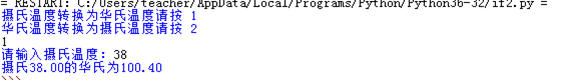 a = int(input('摄氏温度转换为华氏温度请按 1\n华氏温度转换为摄氏温度请按 2\n')) if a==1: c = float(input('请输入摄氏温度:')) f = c*9/5+32 print('摄氏{:.2f}的华氏为{:.2f}'.format(c,f)) else: f = float(input('请输入华氏温度:')) c = 5/9*(f-32) print('华氏{:.2f}的摄氏为{:.2f}'.format(f,c))