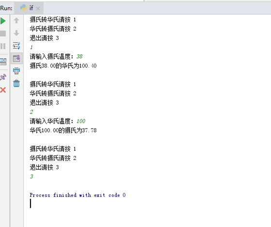 while True: a = int(input('摄氏转华氏请按 1\n华氏转摄氏请按 2\n退出请按 3\n')) if a==1: c = float(input('请输入摄氏温度:')) f = c*9/5+32 print('摄氏{:.2f}的华氏为{:.2f}\n'.format(c,f)) elif a==2: f = float(input('请输入华氏温度:')) c = 5/9*(f-32) print('华氏{:.2f}的摄氏为{:.2f}\n'.format(f,c)) else: break