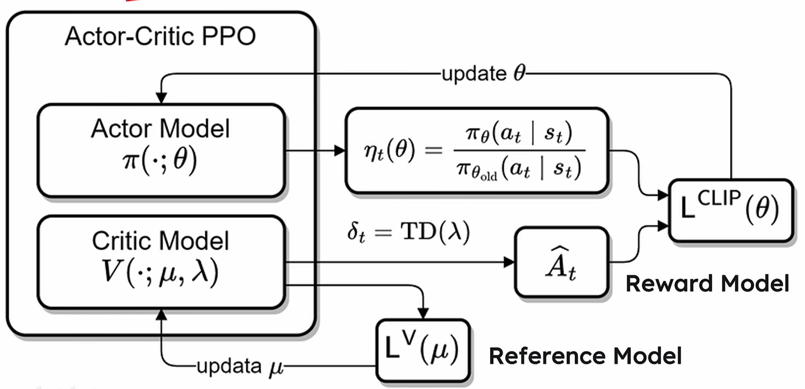 (2)PPO:在reinforcement learning中,直接优化policy model会导致不稳定的训练,模型可能因为过大的参数更新而崩溃。最直观的解决办法就是限制policy的更新幅度,使得每一步训练都不会偏离当前policy太多,同时高效利用采样数据,并且使用advantage function评价某个动作的相对好坏。网络架构如下: