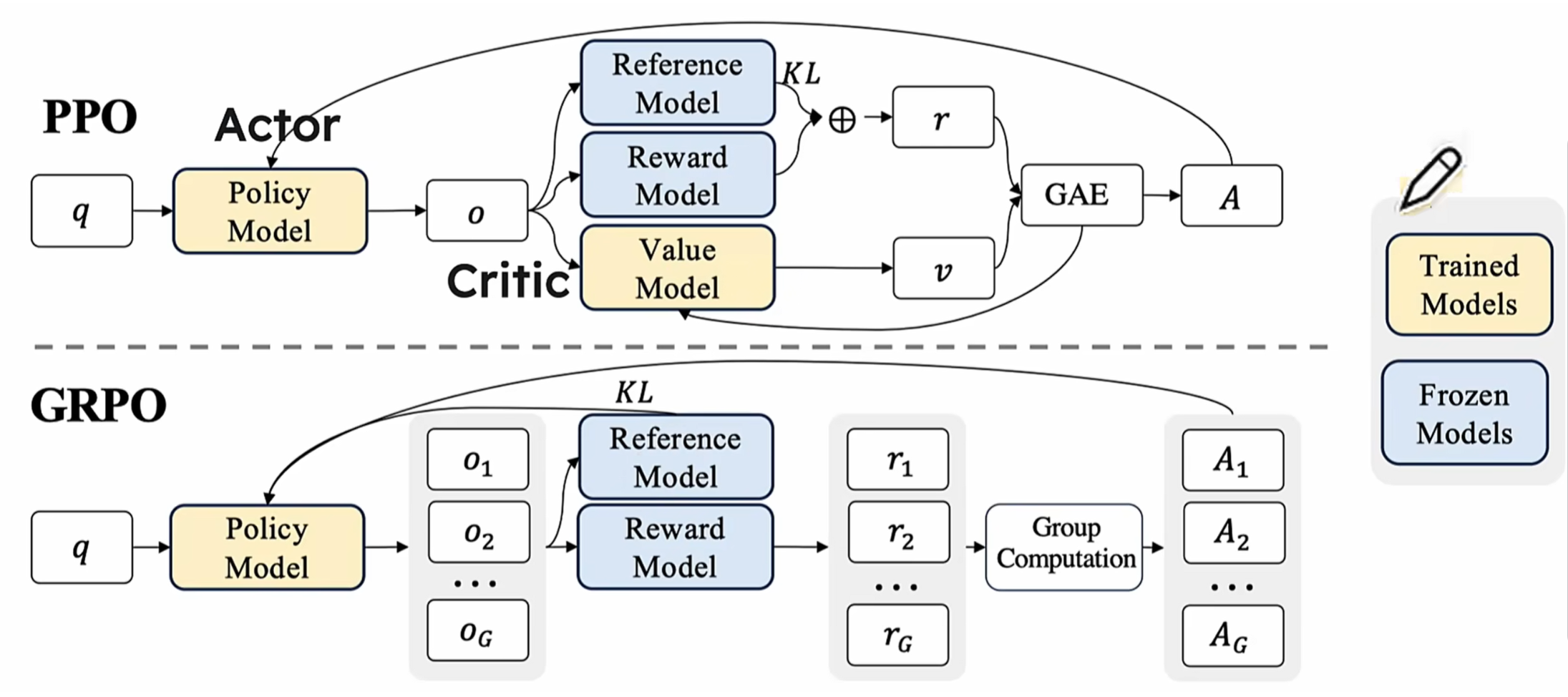 2、(1)基于上述的各种reinforcement learning的算法都有缺陷,deepseek都没采用,而是采用了Group Relative Policy Optimization的算法!先来看看GROP和PPO之间的架构对比, 如下: