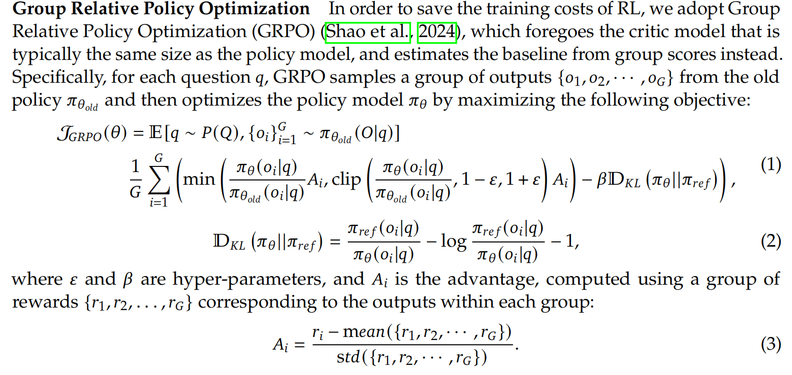 - 那么问题来了:既然没有value model,怎么评价action的好坏了?这里用了advantage计算value,也就是当前action的reward和mean相比,谁更大;如果大于mean,就是好的action,这种action就要鼓励policy model往这些超过均值的action靠拢!!因为有了output score的计算公式,所以不再需要value model了!也即是说下面的Ai公式替代了value model!GRPO主要的创新之一:每次生成多个output,用规则计算每个output的reward,然后往高reward的方向演进(像不像生物基因突变后的进化啊)!
