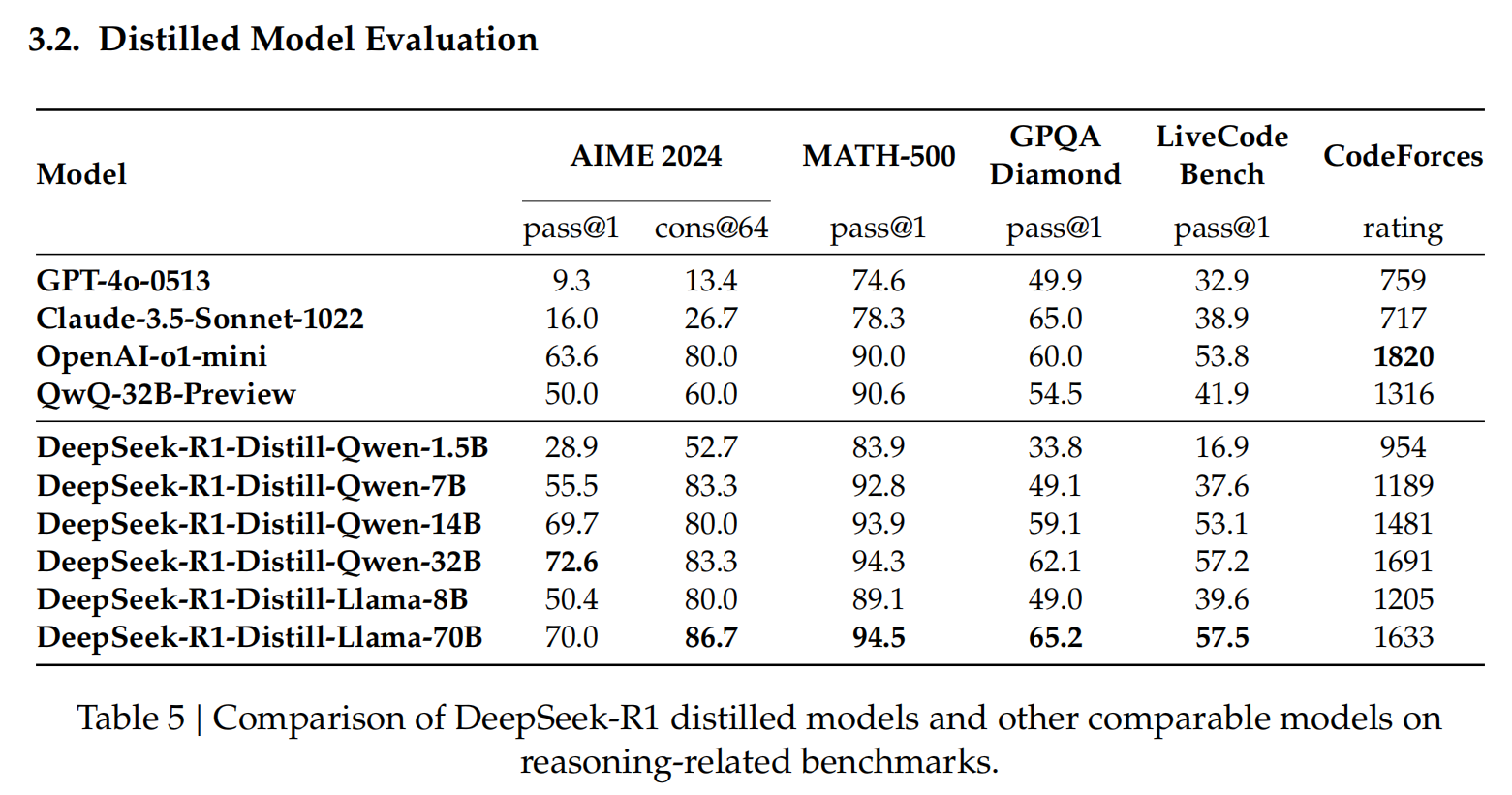 用R1蒸馏后的小模型效果对比:小模型能力差,并不是因为参数少,而是之前的训练方式不对;如果有好的teacher model,用teacher(必须要有COT能力的)蒸馏训练小模型,在某些细分的垂直领域,效果比直接用reinforcement learning训练小模型好!(大模型输出的是概率分布soft target,包含了很多dark knowledge;小模型如果自己用SFT或RL学,目标是hard target,信息少了很多;详见:https://www.cnblogs.com/theseventhson/p/18303028 ) 从下面的对比就能看出,distll中1.5B模型的性能在某些特定数据集上达到了GPT-4O的水平,32B的性能达到了o1-mini的水平,小模型也能有大能力啊!